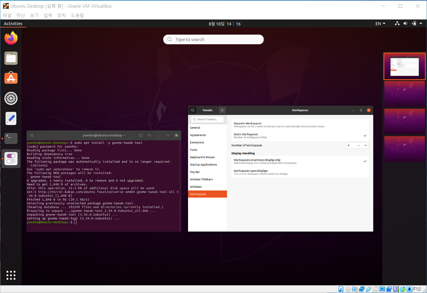 설치가 끝났다면 Show Applications에서 Tweaks를 실행하고 Workspaces 메뉴에 들어가서