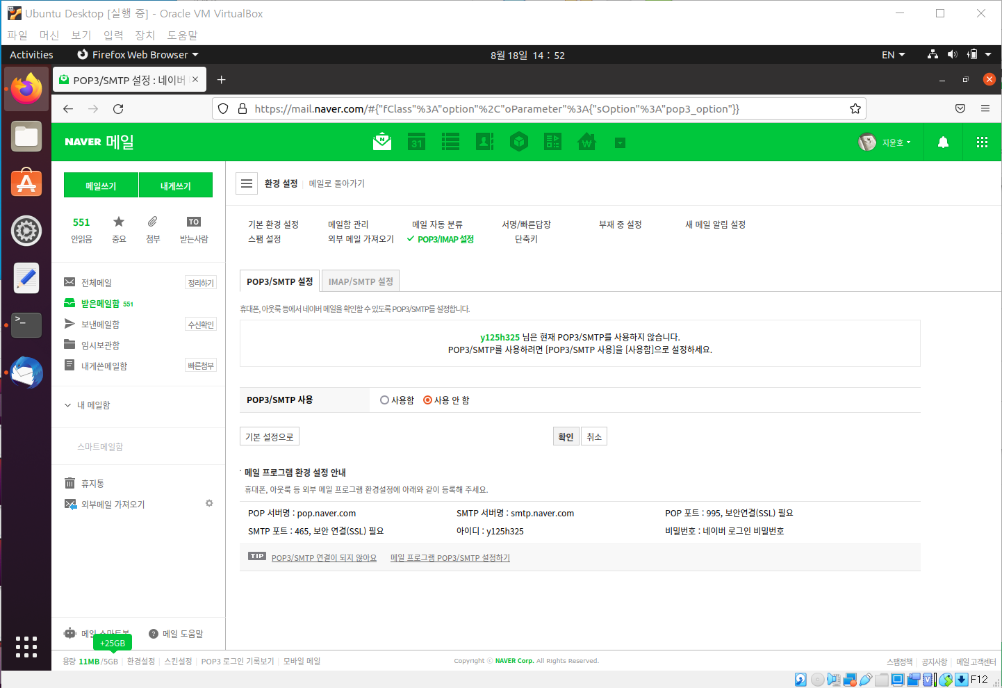 네이버 메일 -> 환경설정 -> POP3/IMAP 설정에 들어가서