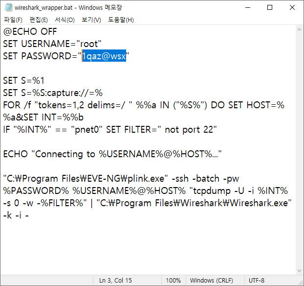 먼저 C:\Program Files\EVE-NG\wireshark_wrapper.bat 파일을 메모장(관리자 권한)으로 연다.
